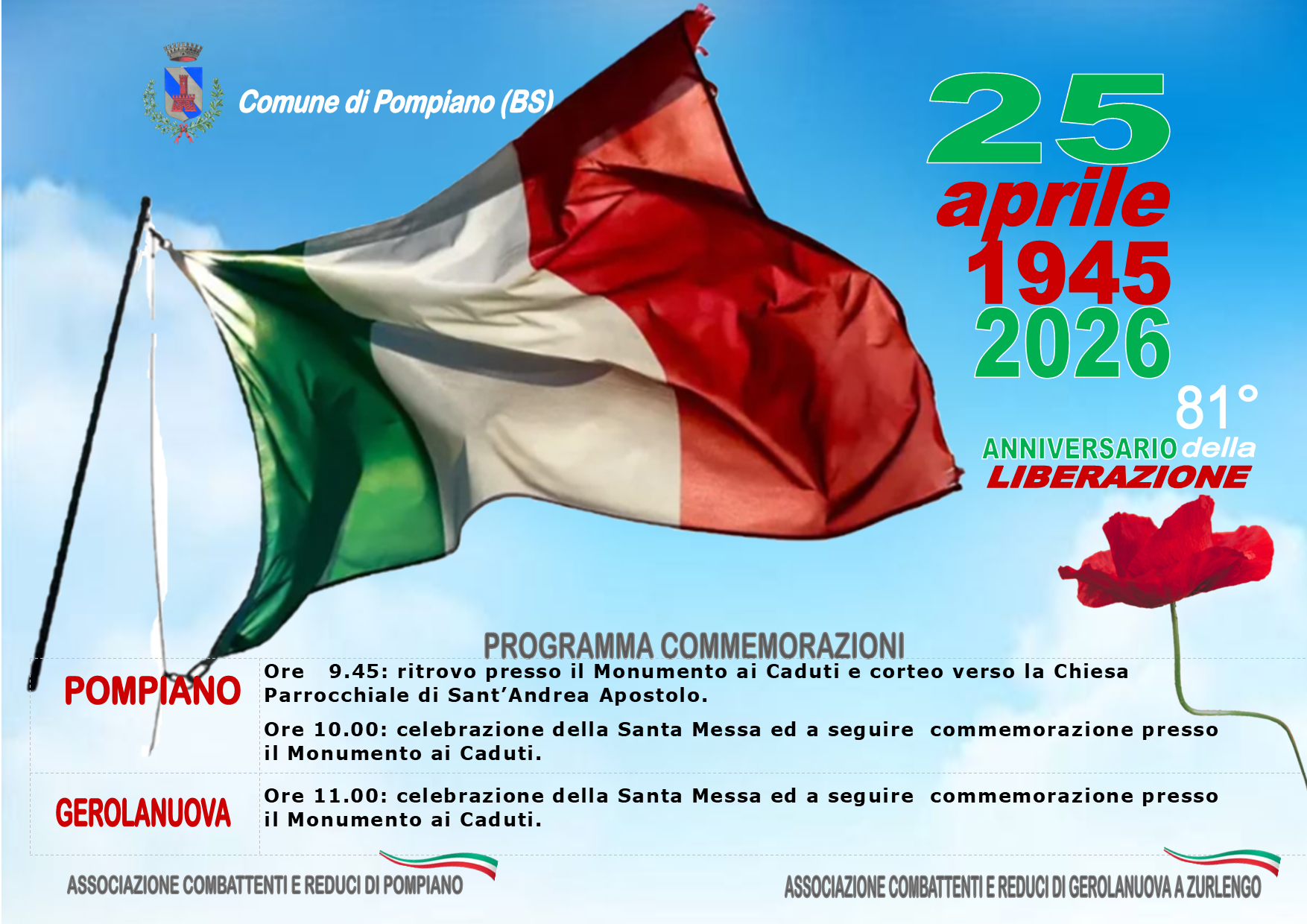 L'Amministrazione Comunale e le Associazioni Combattenti e Reduci di Pompiano e di Gerolanuova e Zurlengo invitano tutta la popolazione a partecipare alle cerimonie commemorative, come da programma allegato.